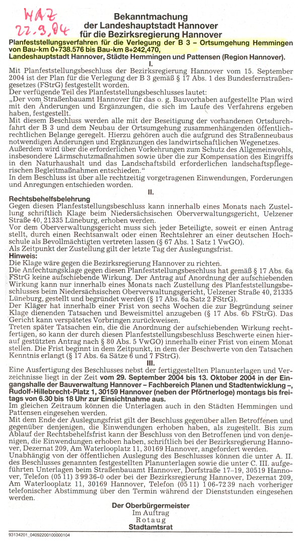 Bezirksregierung Hannover verkündet Planfeststellungsbeschluss für die Ortsumgehung Hemmingen - Verlegung der Bundesstraße B 3 - .