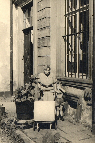 Sommer 1952 --- Großmutter (Gerta) Steinert mit meinem Bruder Roman (im Kinderwagen) und mir