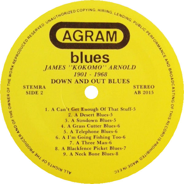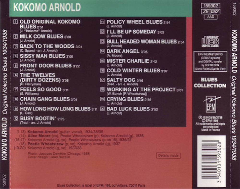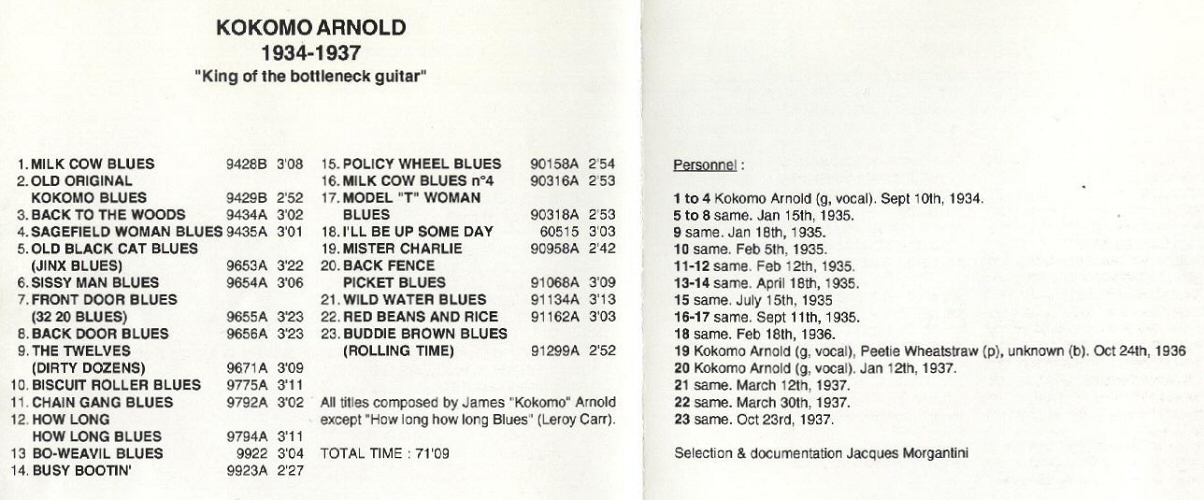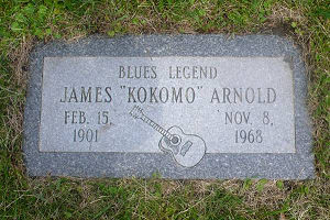 Kokomo Arnold in his home in Chicago, September 1959source: Front cover of EMP Musique CD 59302; photographer: Jacques Demêtre Kokomo Arnold in his home (4413 South Calumet Avenue) in Chicago, IL, September 1959source of photo on the left: Philippe Bas-Rabérin (ed.): Blues - Les Incontournables.- Paris (Éditions Filipacchi) 1994, p. 13source of photo on the right: Jacques Demêtre & Marcel Chauvard: Voyage au Pays du Blues.- Levallois-Perret (CLARB-Soul Bag) 1994, p. 146photographer: Jacques Demêtre Kokomo Arnold and Jacques Demêtre in Arnold's home (4413 South Calumet Avenue) in Chicago, IL, September 1959source: Steve Cushing: Pioneers of the Blues Revival.- Urbana, Chicago, and Springfield (University of Illinois Press) 2014, p. 249photographer: Jacques Demêtre / Soul Bag Archive Kokomo Arnold's headstone, put up by André Cochepin Mingarroat Burr Oak Cemetery (4400 W. 127th Street, Alsip, Illinois), section Acacia Lawn, lot 323, grave 5source: http://blindman.fr.yuku.com/topic/26871#.WAINKfmLSUkphotographer: Jocelyn Richez Leon Terjanian: "Kokomo Arnold"Blues Link No. 2 (Oct/Nov 1973), p. 27-30 The article above is 'published' here for private research only. While of historical interest, it may contain factual errors only revealed by later research. Be advised that more recent reference works should be consulted regarding factual points such as spelling of names, dates of birth, dates of recordings.