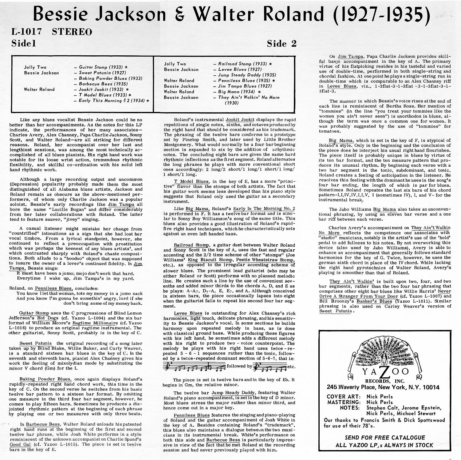 notes by Stephen Calt, Jerome Epstein, Nick Perls, Michael Stewart = Yazoo L-1017 (US 19??)