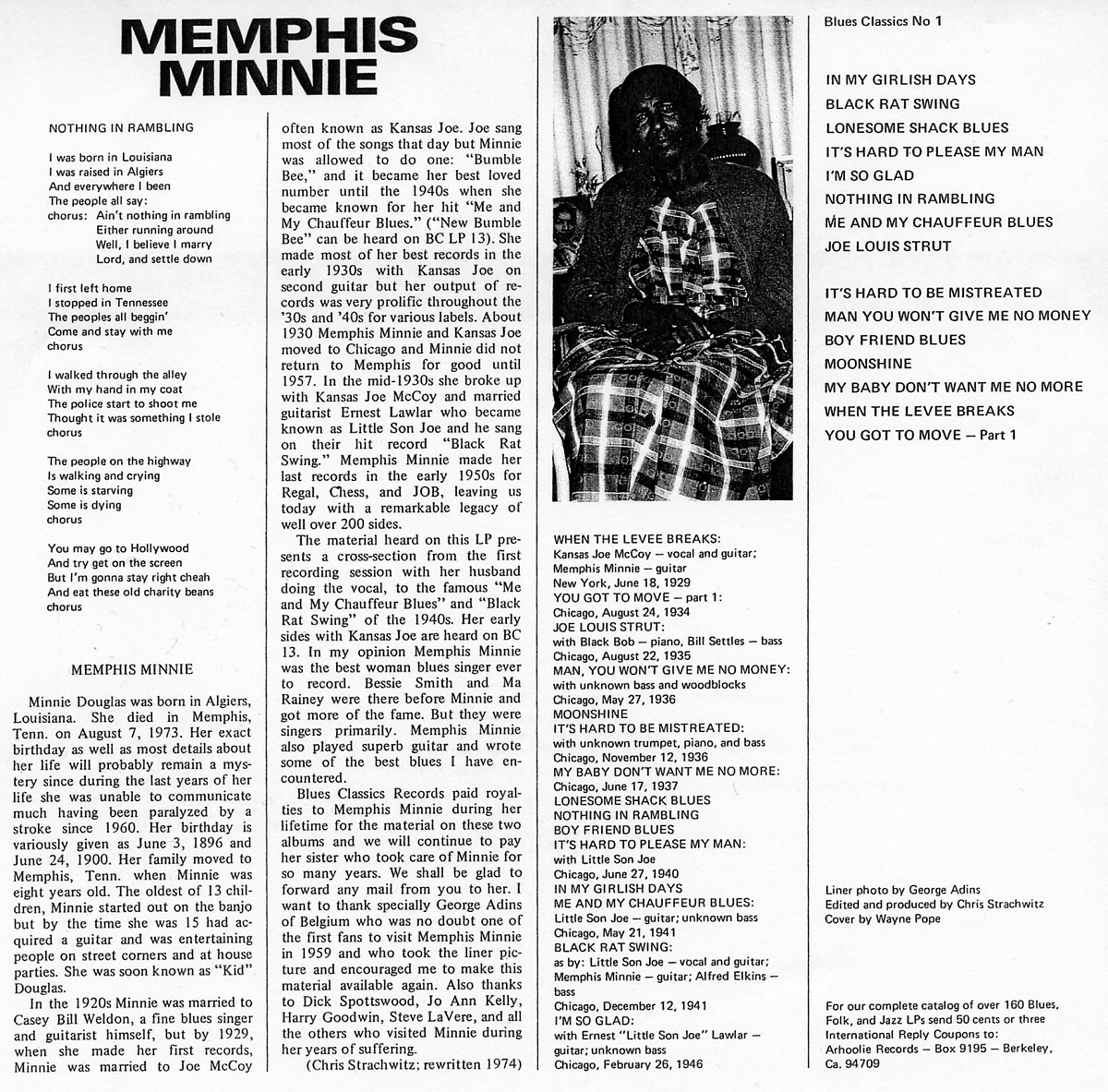 notes (rewritten 1974) by Chris StrachwitzBlues Classics BC 1 (US 1974)