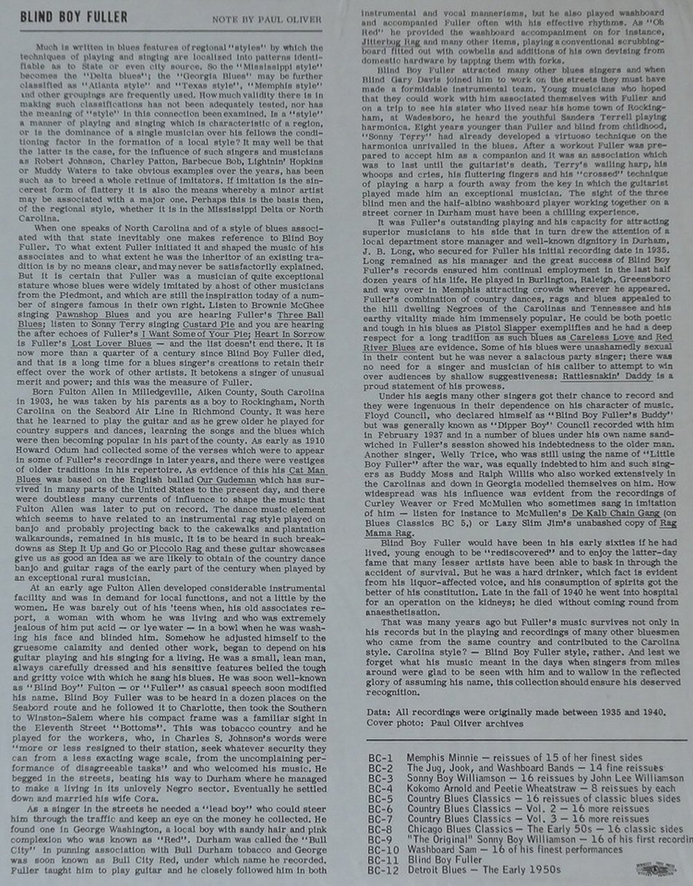 notes by Paul Oliver Blues Classics BC 15 (1968)