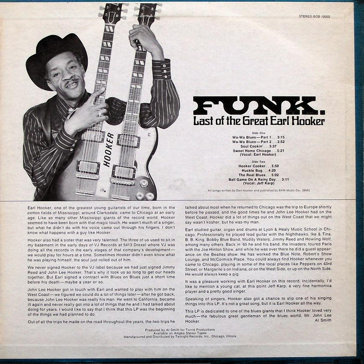 Antilles LP 7024 track list: - Wah-Wah Blues - part 1 [] - Wah-Wah Blues - part 2 [] - Soul Cookin' - Sweet Home Chicago # - Hooker Cooker - Huckle Buck - The Real Blues - Ball Game On A Rainy Day * rec. May 5, 1969 in Chicago, IL; Earl Hooker, g, # voc; Jeff Karp [actually Jeff Carp], hca, * voc; poss. Boots Hamilton, org; Paul Asbell, g; Gino Skaggs, b; Roosevelt Shaw, dr; prod. by Al Smith