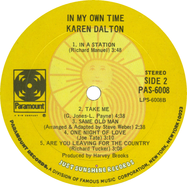 prod. by Harvey Brooks; arrangements by Harvey Brooks & Karen Dalton; Karen Dalton, voc, 12-str. g, bj; Richard Bell, p; Harvey Brooks, b; Marcus Doubleday, tp; Robert Fritz, Belch cl; Amos Garrett, g; John Hall, g (solo on 'In My Own Dream'); Dan Hankin, g; Bill Kieth [sic], steel g; Hart McNee, ten sax; Bobby Notkoff, violin; Ken Pearson, org; Dennis Siewell, dr; John Simon, p; Gregg Thomas, dr; Dennis Whitted, dr