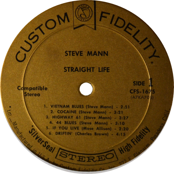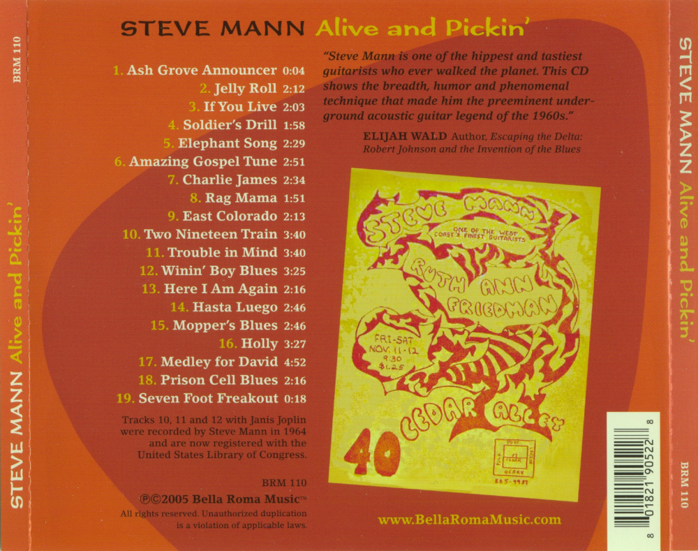 "This album contains ten examples of the guitar artistry of a living legend; a musician who has not played before an audience for almost a decade, but whose name still inspires awe and reverence among guitarists all over the world. Steve Mann is regarded by many to be one of the finest blues singer guitarists of all time. This recording, taped in 1967 shortly before his departure from the public eye, captures him at his creative peak. Steve differed from most of his contemporaries in that he tried to inject a jazz feeling into a basic folk-blues format. The term "folk music" implies certain musical factors such as the use of traditional diatonic harmony, three chord progressions, very few dissonances or chromaticisms, etc. Steve, however, did not stop there. He experimented with modern chords and even atonal passages on occasion. He was influenced by modern blues-oriented performers like Mose Allison and Lou Rawl[e]s as well as the more traditional bluesmen. One of his biggest influences was Ray Charles. The guitar work on Drown In My Own Tears is patterned after Charles' piano line from his own recording. At the same time, Steve never lost touch with the traditional nature of his music. He understood his idiom thoroughly and was equally at home playing a Mississippi Delta blues (Walking Blues), a traditional folk song (Pallet On The Floor) or a contemporary folk hit (Green Green Rocky Road). His guitar work, always stunning, is especially brilliant on this last number. Because Steve was best known for his instrumental virtuosity, it is easy to overlook the fact that he was also an outstanding vocalist. Even though his music was largely based on rural southern blues, Steve never tried to sound like a rural Southerner. A city boy, Steve did not pretend to be anything else. Rather than try to imitate a basically foreign tradition, he drew upon that tradition and adapted it to suit his own vocal style. The result is a synthesis of the rural and the urban, the deep South and the West Coast coupled with the kind of emotional intensity which distinguishes the true artist. Steve was deeply involved with the San Francisco Rock experiments. He played with members of Jefferson Airplane and The Grateful Dead and recorded a thus far unreleased album with Janis Joplin. Jorma Kaukonen paid him a tribute on the first Hot Tuna album with a tune called Mann's Fate. Steve also worked with such notables as Frank Zappa, Taj Mahal, Mac Rebennack (Dr. John), Sonny and Cher, Dick Rosmini, Hoyt Axton, Barney Kessel, Howard Roberts, Van Dyke Parks, John Kay, Gene Page and many others. His own band, The City Lights, received rave reviews and critical acclaim before disbanding. His only previously released record, Straight Life (Custom Fidelity CFS 1675), is now out of print, but Blue Goose Records is preparing an album to be issued in the near future. Steve's health gave way shortly after these recordings were made. He is now living in Marin County, California, where he is slowly regaining his strength. It is our hope that someday he will be well enough to resume his career. Meanwhile, Half Blind's Choice is proud to present this fine recording as our first release." -Mike Perlowin- (Mike Perlowin, a fine guitarist in his own right, is a former student of Steve's.)