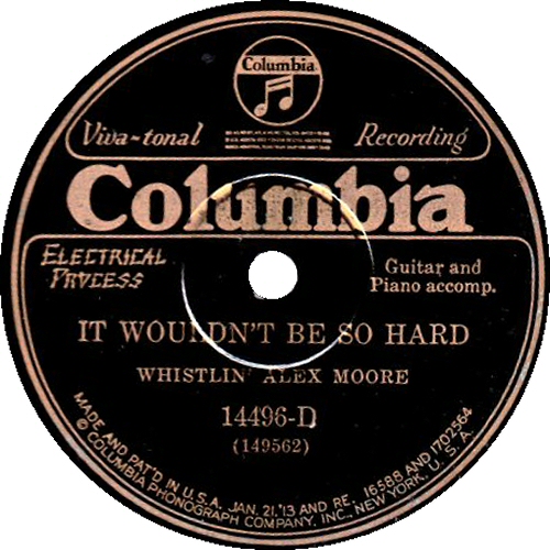notes by Paul Oliver "Arhoolie Records, Box 9195, Berkeley, CA. 94709" = Arhoolie F 1008 (US 19??) "Alex Moore", on labels: ""Whistling" Alex Moore" or "Alex Moore"