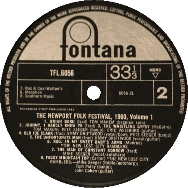3 CD set, compilation of Fontana TFL 6056 (CD1), Fontana TFL 6057 (CD2) and Elektra EKS 7189 (CD3) (=) Not Now Music NOT3CD076 (UK 2012) "The Newport Folk Festival 1960"