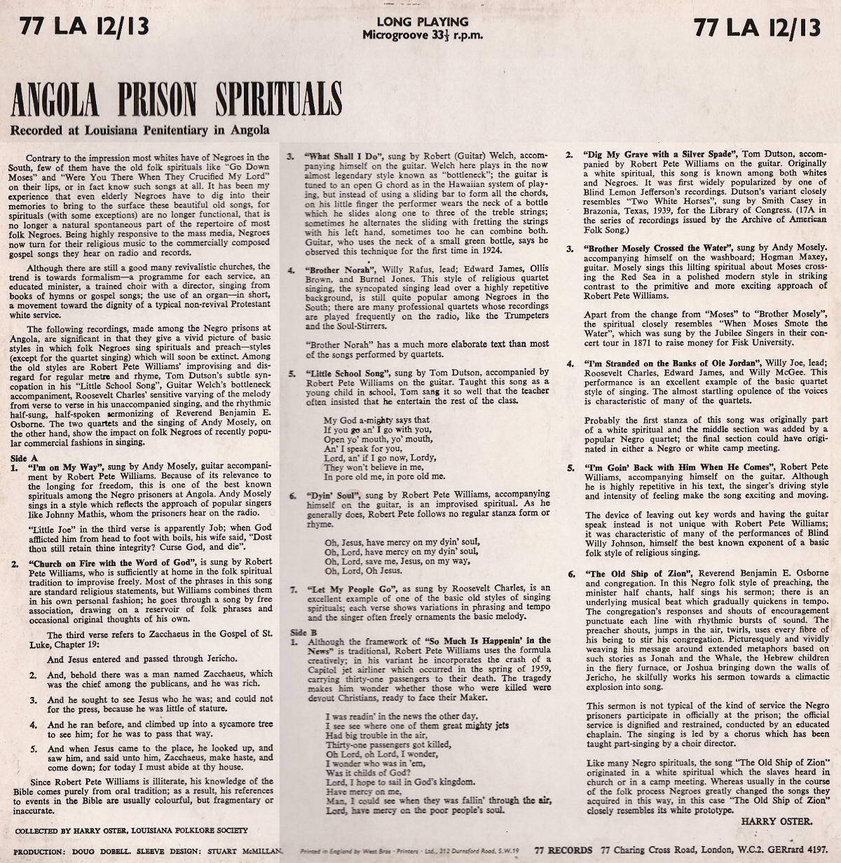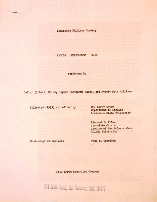 notes by Harry Osterand Richard Allen& Paul B. Crawford = Arhoolie R 2011 (1971)Angola Prisoner's Blues