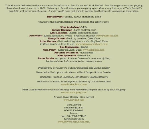 rec., mixed and mastered by Gunnar Backman at Brakophonic 2005-2006; Tom Paley, voc, ac g, banjo, fiddle; Bert Deivert, ac g, voc, weissenborn, banjo, mandolin