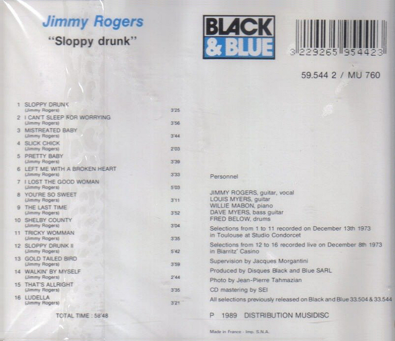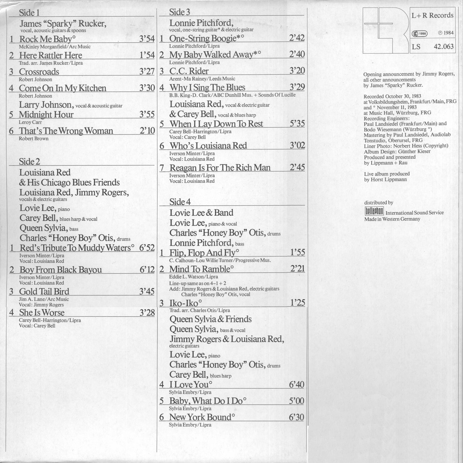 At Silvio's Lounge, Chicago, IL, mid 1950s: Band in the background, l to r: Muddy Waters (wearing glasses), Otis Spann, Elga Edmonds, Jimmy RogersAt the bar, l to r: Viola Spearman (Koko Taylor's sister), Levi Walton (Koko Taylor's brother), Vera Walton (Levi Walton's wife), Koko Taylor, Robert Taylor, Savannah Becton (Koko Taylor's sister) source: "Koko Taylor Collection, courtesy of Alligator Records - Tim Kolleth" at https://bobcorritore.com/photos/koko-taylor-photo-page/; a bit photoshop treated by Stefan Wirz Mighty Joe Young, Jimmy Rogers & Art 'Kid' King at The Square Deal Club, 230 W. Division, Chicago, January 1958source: Block - Tijdschrift voor Blues #101 (januari/februari/maart '97), p. 13; photographer: Yannick Bruynoghe Mighty Joe Young & Jimmy Rogers at The Square Deal Club, 230 W. Division, Chicago, January 1958source: Block - Tijdschrift voor Blues #101 (januari/februari/maart '97), p. 13; photographer: Yannick Bruynoghe Hanging out in Muddy's basement at 4339 South Lake Park Avenue, Chicago, IL:James Cotton, Sonny Boy Williamson, Jimmy Rogers, Muddy Waters, Otis Spann (1959) source: Front page of Block - Tijdschrift voor Blues #85 (jan/feb/mrt '93)photographer: Georges Adins ("met dank aan Kees van Wijngaarden")James Cotton's face pasted from http://www.youtube.com/watch?v=BmoNlTH66_8 by Stefan Wirz Phillip Walker, Hans W. Ewert, Jimmy Rogers, JohnnyLittlejohn, Robert Cray; Blues Fest Bonn, July 21, 1985source: Blues Forum #19 (February 1986), p. 15; photographer: Norbert Hess