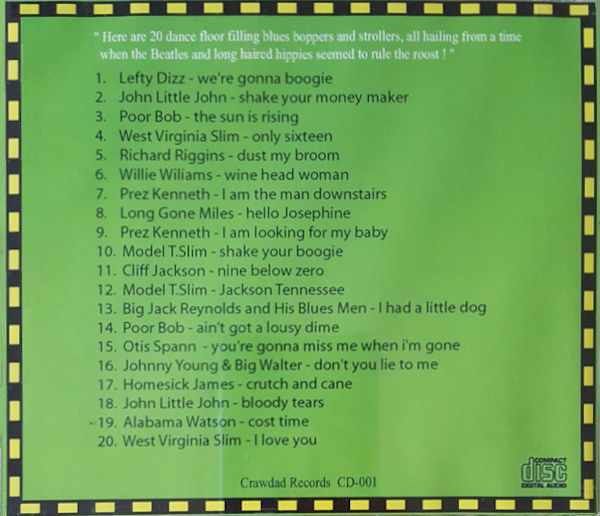 Evidence ECD 26087-2 track sequence: Fred McDowell - Highway 61 (1965) Lightnin' Hopkins - Baby Please Don't Go (1964) John Lee Hooker - Della Mae (1965) Memphis Slim - Wish Me Well (1963) Muddy Waters - Five Long Years (1963) Big Mama Thornton - Hound Dog (1965) Howlin' Wolf - Dust My Broom (1964) T-Bone Walker - I'm In Love (1962) Sunnyland Slim - Everytime I Get To Drinkin' (1964) Buddy Guy - First Time I Met The Blues (1965) Sugar Pie DeSanto - Slip In Mules (1964) Shakey Jake - Love My Baby (1962) Eddie Boyd - Five Long Years (1965) Sonny Boy Williamson - Dissatisfied (1964) Otis Spann - Goin' Down Slow (= "Had My Fun") (1963) Brownie McGhee - Crying At The Station (1962) J.B. Lenoir - Slow Down (1965)