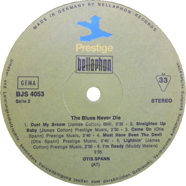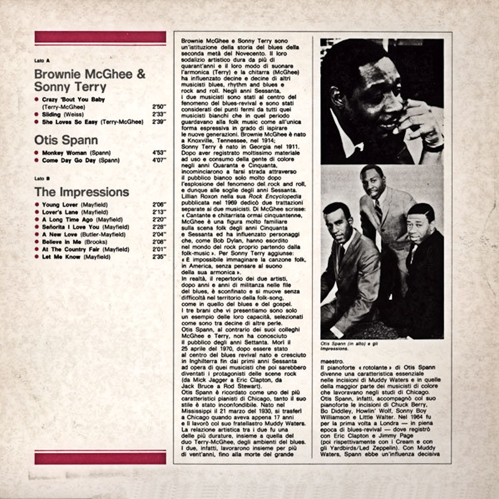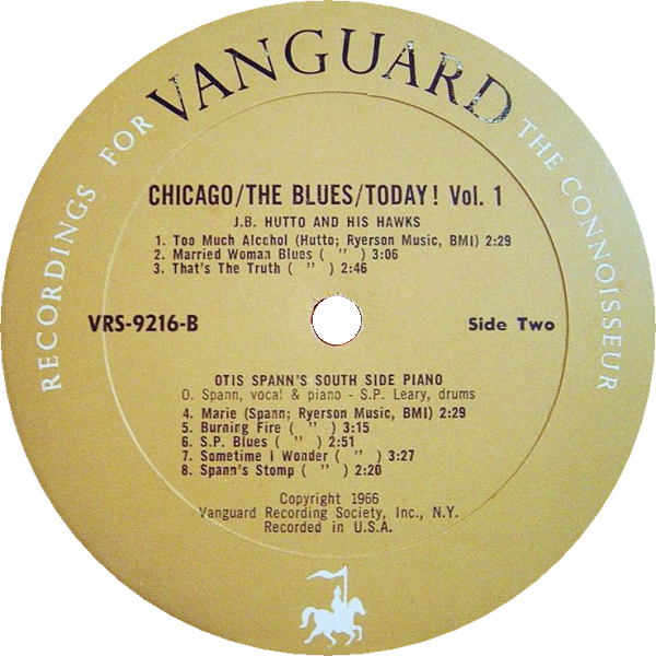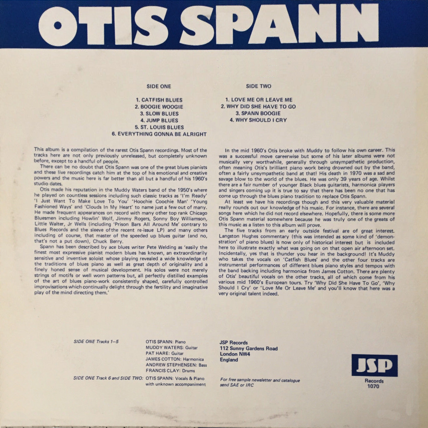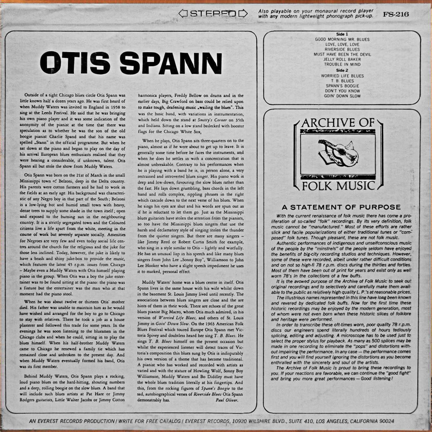 notes by Paul Oliver = Everest/Archive Of Folk & Jazz FS 216 (US 3/1968) "Otis Spann"= Gamma/Archive Of Folk Music 6-8907 (Fr 19??) mispress: Side A was pressed at wrong speed (too high)