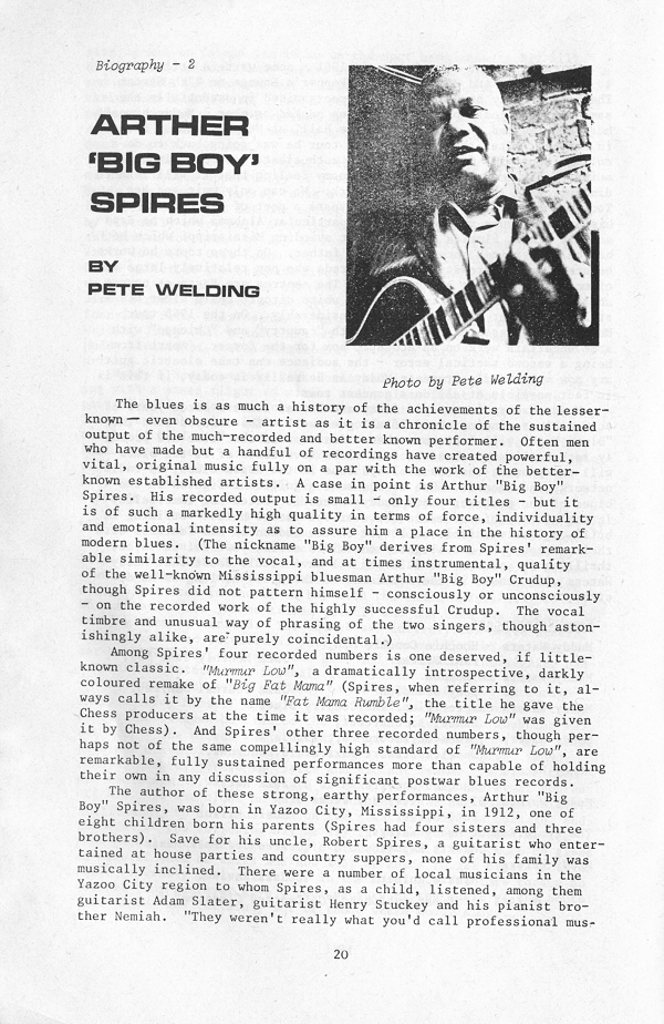 Pete Welding: Arthur 'Big Boy' Spires: A Bio-Discography.-in: Simon A. Napier (ed.): Back Woods Blues.- Bexhill-On-Sea 1968, pp. 20-22 (reprint from Blues Unlimited 28 (1965))