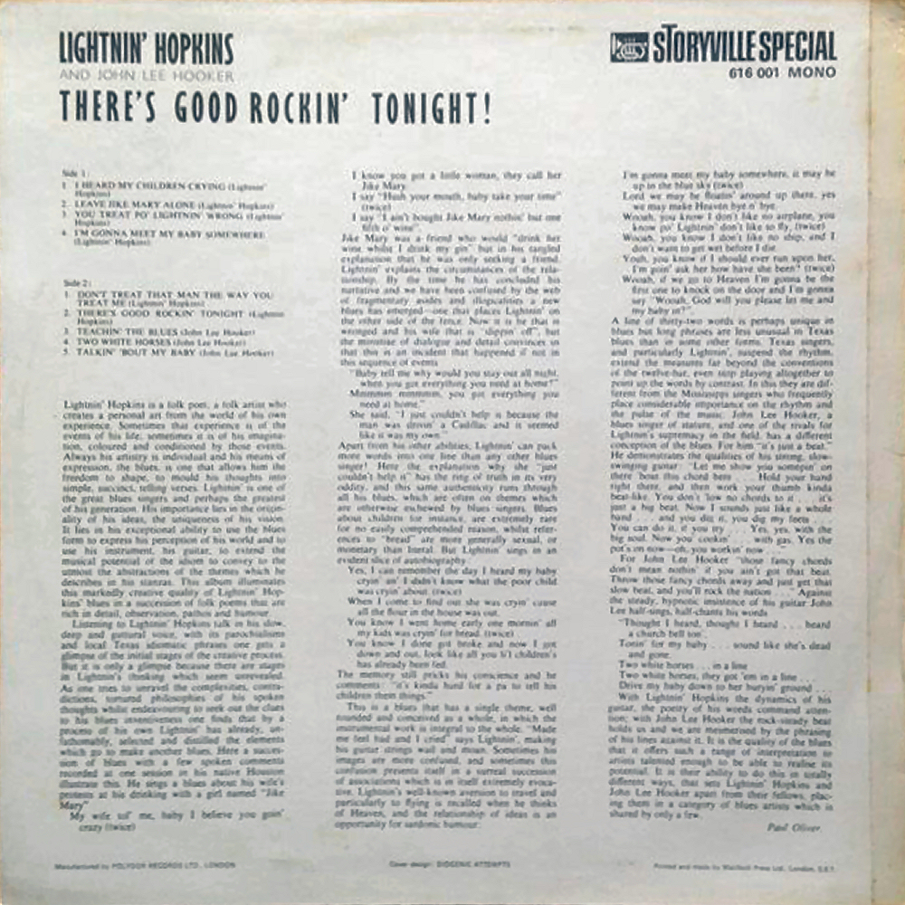 notes by Paul Oliver Storyville Special 616 001 (UK 1965) "Lightnin'Hopkins and John LeeHooker: There's GoodRockin' Tonight"