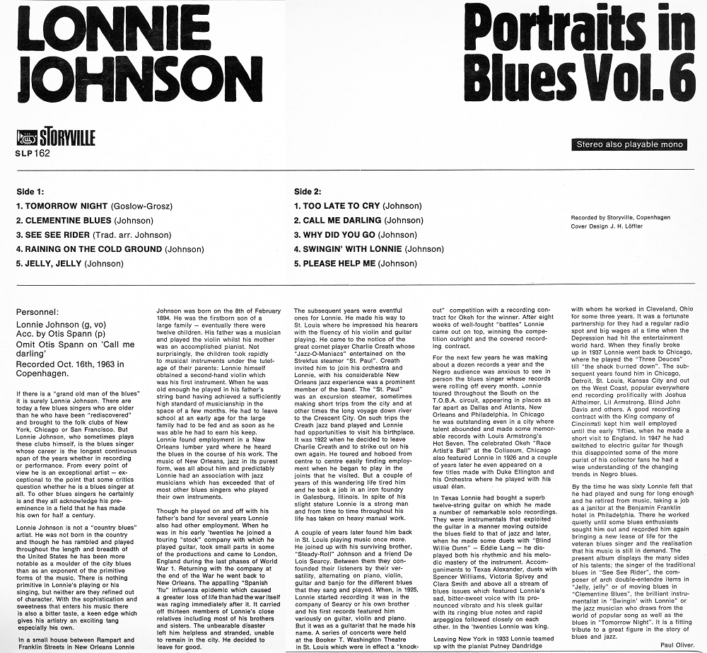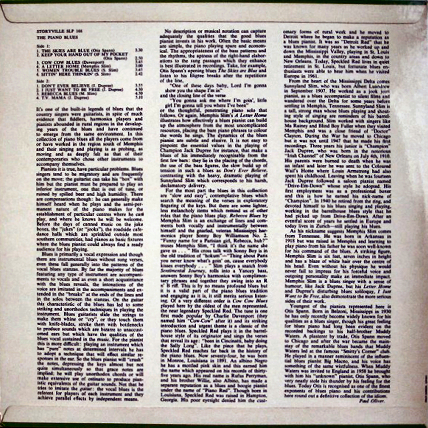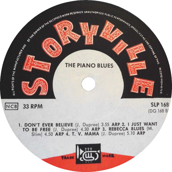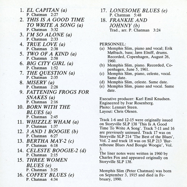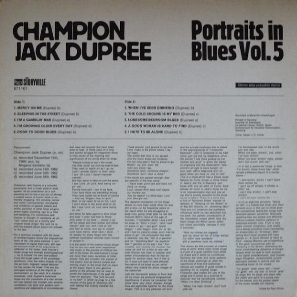 Storyville SLP 107 track list: - Roll Me Over And Roll Me Slow - Daybreak Stomp - That's All Right - Reminiscin' With Champion Jack - I Had A Dream - House Rent Party - Snaps Drinking Woman - One Sweet Letter From You - Johnson Street Boogie Woogie - Misery Blues - When Things Go Wrong - New Vicksburg Blues rec. December 29, 1959 in Copenhagen, Denmark; Champion Jack Dupree, voc, sp, p Storyville SLP 107 cover drawing by Jens Nordsø