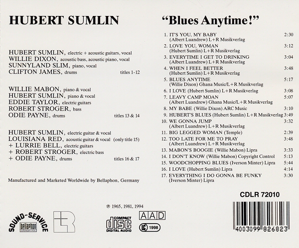 Hubert Sumlin: Blues Classics (Bellaphon CDLR 82007 1996) - Love You, Woman [] - When I Feel Better # - I Love [] - Hubert's Blues # - Blues On Blues - My Baby Is Gone - Lonesome Blues - Blues In My Hand - Blues For Chester - Jammin' The Blues - Gamblin' Woman [] # rec. Nov. 1, 1964 at the Amiga-Studios in East-Berlin, GDR; Hubert Sumlin, [] g + voc. # g solonotes by Norbert Hess L+R 42.008(=) Bellaphon CDLR 82007(1996) "Blues Classics"L+R Records discography