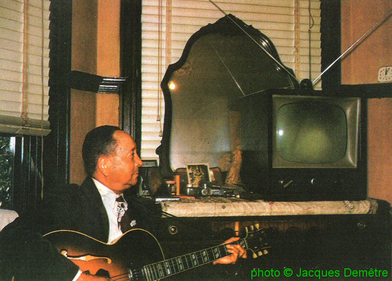 Tampa Red at his home, 1963"Tampa Red no longer played in 1963, but he still loved his guitar. Kept it set up right across the room from where he sat so he could always easily see it.He held it for this photograph I took of him when Big Joe Williams, Michael Bloomfield, and I visited him."source: 09/28/2020 facebook post by George Mitchell; photographer: George Mitchell