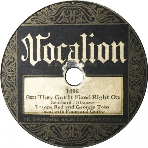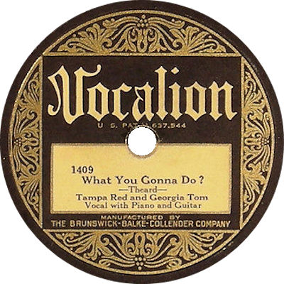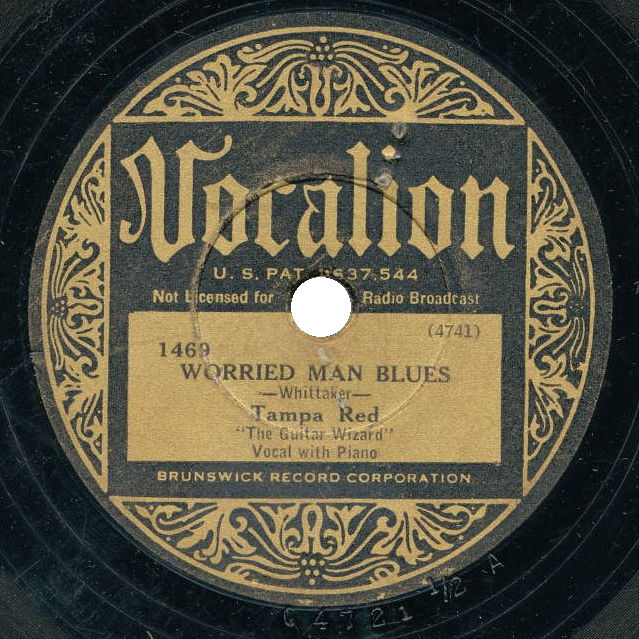 Vocalion 1469 2nd ed. Tampa Red, "The Guitar Wizard" - Worried Man Blues (C-4721½-A, "4741" printed on label) # Tampa Red and Georgia Tom - Mrs. Baker's Blues (C-5033-A) * unissued tracks from same sessions: - Mrs. Baker's Blues (C-4722-C) ## - Mrs. Baker's Blues (C-5032) * # rec. November 19, 1929 in Chicago, IL; Tampa Red, voc, g; Georgia Tom, p, ## voc * rec. December 17, 1929 in Chicago, IL; Tampa Red, voc, g; Georgia Tom, p