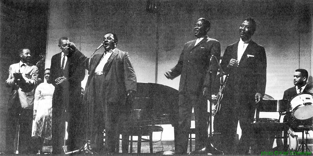 Finale of the American Folk Blues Festival 1963 (October 8, 1963 at Deutsches Museum, Munich)(l to r) Lonnie Johnson, Willie Dixon (hidden), Victoria Spivey, Sonny Boy Williamson, Otis Spann (hidden),Big Joe Williams, Memphis Slim, Matt Murphy (hidden), Muddy Waters, Bill Stepneysource: Blues Forum Nr. 10 (2. Quartal 1983), p. 22/23: photographer: Karl Schneider