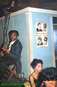 John Lee "Sonny Boy" and Lacey Belle Williamson, with a young Muddy Waters (left)and Eddie Boyd (centre, standing), mid 1940s at the Club Georgia on Chicago's south side;other persons are Andrew 'Bo' Bolton (Muddy's long time chauffeur, sitting far right), the womanstanding on the right is Mrs. White, wife of the club owner, the boy standing on the leftis Mrs. White's son, who helped out at the clubsource: Rowe 1975, p. 42 (credited to "Chess Records"); a bit photoshopped by Stefan Wirz