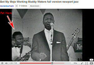 Muddy Waters at Smitty's Corner in Chicago, November 1957source: Back cover of Rhythm & Blues Panorama N° 29 (5é année - 1964)photographer: Georges Adins Muddy Waters Band at Silvio's Lounge, Chicago, December 1957Pat Hare, g; Otis Spann, p; Muddy Waters, voc; Big Crawford [died in March 1956!] Samuel "Singin' Sam" Chatmon, b;unknown saxophonist [prob. Sax Mallard]; Elga Edmonds, dr [in adjacent photo!]; James Cotton, hca [in main photo only hands holding microphone visible]source of main photo: de.pinterest.com/pin/440508407276721410/source of photo on the right: Living Blues 208 (August 2010); www.issues.louisvillemusicnews.net/2011/2011April/rambleapril2011.phpphotographer: Yannick Bruynoghe, December 1957 (same location, but not same session as main photo!) source: Front cover of Rhythm & Blues Panorama N° 25 (4é année - 1963) source: Promo card Harold Davison Ltd., London (European Representation) Muddy Waters at Silvio's Lounge, Chicago, December 1957; photographer: Yannick Bruynoghe Muddy Waters at Big Bill Broonzy's burial at Lincoln Cemetery, Blue Island, Illinois, August 19, 1958 l to r: Win Stracke, Muddy Waters, Ransom Knowling (hidden), Studs Terkel, Chet Roble,Brother John Sellers, Tampa Red, Sunnlyand Slim (top of head), Otis Spannphoto by Mickey Pallas, Collection Center for Creative Photography, University of Arizona Hanging out in Muddy's basement at 4339 South Lake Park Avenue, Chicago, IL:James Cotton, Sonny Boy Williamson, Jimmy Rogers, Muddy Waters, Otis Spann, 1959 source: Front page of Block - Tijdschrift voor Blues #85 (jan/feb/mrt '93)photographer: Georges Adins ("met dank aan Kees van Wijngaarden")James Cotton's face pasted from http://www.youtube.com/watch?v=BmoNlTH66_8 by Stefan Wirz (l to r) Eddie Smith (banjoist), two female unknowns (?), Monty Sunshine (clarinetist),Muddy Waters, Lois Anderson, Chris Barber, Ottilie Patterson at Smitty's Corner, 1959source: Robert Gordon: Can't Be Satisfied - The Life and Times of Muddy Waters, New York,Boston (Back Bay Books), 2002, photo pp. without pagination between pp. 204 and 205photographer's name unknown ("Courtesy of Chris Barber") Lois Anderson-Johnson-Clark and Muddy Waterssource: "Muddy Waters Legacy" facebook group; photographer's namenot known ("Courtesy of Leona Anderson"); a bit photoshop embellished by Stefan Wirz Clubbing in Washington, DC (l to r) James Cotton, Matty Rollins [Little Walter's wife],Little Walter, Lois Anderson, Muddy Waters, c. 1959source: ; photographer: Sam Lay Pat Hare at Smitty's Corner, Chicago, September 1959source: "Les Génies du Blues" Vol. 5 (1993), p. 53; photographer: Jacques DemêtreThe young woman is Lois Anderson-Johnson-Clark,mother of Mercy Morganfield, Muddy Waters' 3rd child The FENDER Telecaster ("The Hoss") phase (1957 ff.)The Hoss is/was a blond 57 FENDER Telecaster later refinned and re-necked with a custom made rosewood board neck, screws added to pickguard and amp knobs added by a Chicago luthier. Muddy Waters, British skiffle bandleader Chas McDevitt,and Otis Spann, England, 1958 "The Hoss" Muddy's originally white '57 Fender Telecaster has been modified around 1964/65: The body was painted red, amp knobs& four extra pickguard screws were added and the maple neck was replaced with a custom wider neck, with a rosewoodfingerboard, to better accomodate Muddy's large hands From existing photos/footage the changes on that guitar must have been made around 1964/65: He appeared playingthe white Telecaster on TV in England on May 7, 1964, and the modified one on August 14, 1965 Muddy Waters with Isaac Washington at Carnegie Hall in New York City, April 3, 1959photographer: John CohenThe harmonicist is *not* Little Walter, as almost all internet sources claim!"Don't Follow Leaders, Watch The Pawking Metaws." Muddy Waters at Newport, July 3, 1960posing with John Lee Hooker's guitar, a HARMONY Monterey archtop source: William Claxton & Joachim E. Berendt "Jazzlife - A Journey for Jazz across America in 1960".- Köln/Cologne (Taschen) 2013, p. 541photographer: William Claxton 1963 AFBF ensemble (arrival at Frankfurt a.M. airport): from top: three airline company employees, Memphis Slim, Otis Spann, Muddy Waters, Bill Stepney,Sonny Boy Williamson; front row: Big Joe Williams, Len Kunstadt, Victoria Spivey, Willie Dixon; behind Willie Dixon: Matt 'Guitar' Murphysource of photo on the left: www.flickr.com/photos/7863952@N04/462846538/source of photo on the right: Juke Blues 20 (1990), p. 10 "(courtesy 1968 AFBF programme)" American Folk Blues Festival '63 at the Kurhaus Baden-Baden, Germany, September 29, 1963(l to r) Bill Stepney's drums (part of them), Memphis Slim, Muddy Waters, Big Joe Williams,Sonny Boy Williamson, Lonnie Johnson, Victoria Spiveysource: Record Research 56 (November 1963), p. 5; photographer: Stephanie Wiesand Finale of the American Folk Blues Festival 1963 (October 8, 1963 at Deutsches Museum, Munich)(l to r) Lonnie Johnson, Willie Dixon (hidden), Victoria Spivey, Sonny Boy Williamson, Otis Spann (hidden),Big Joe Williams, Memphis Slim, Matt Murphy (hidden), Muddy Waters, Bill Stepneysource: Blues Forum Nr. 10 (2. Quartal 1983), p. 22/23: photographer: Karl Schneider Muddy Waters on UK tour ("The American Folk Blues and Gospel Caravan"), April/May 1964 Muddy Waters with Roger Eagle and Roger Fairhurstat the Brazennose Street Twisted Wheel in Manchester, UKsource: "Roger, The Eagle Has Landed - A selection of black and whitephotos by Brian Smith of Roger Eagle from his extensive archive."by Mark Radcliffe; photographer: Brian Smith Front cover of R'n B Scene Vol. 1 No. 3 (1964)Muddy playing his white '57 Fender Telecaster ("The Hoss")photographer's name not given, most likely Brian Smith Muddy Waters playing cards with Roger Eagle in the backgroundat the Brazennose Street Twisted Wheel in Manchester, UKsource: "Roger, The Eagle Has Landed - A selection of black and whitephotos by Brian Smith of Roger Eagle from his extensive archive."by Mark Radcliffe