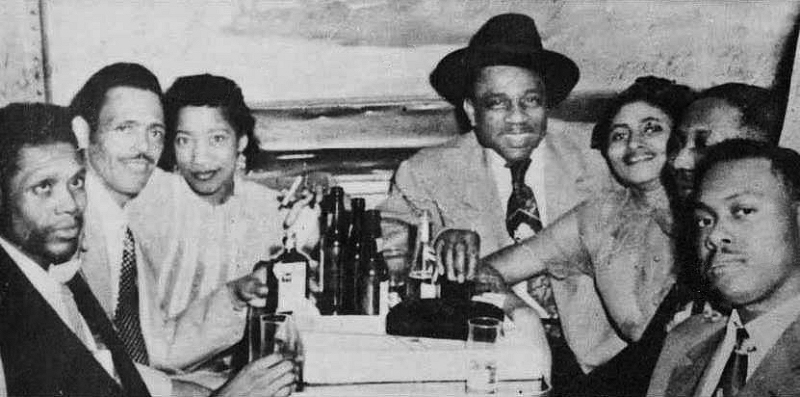 Walter Horton, Willie Nix, Pattie Nix, J.T. Brown, "Kattie", Muddy Waters, and Jimmy Rogersat a gathering in Chicago of former Mississippi musicians, c. early 1953 source: Mississippi Blues Trail marker #144, dedicated November 4, 2011("courtesy Patty Nix/Delta Haze Corp."); a bit photoshop treated by Stefan Wirz