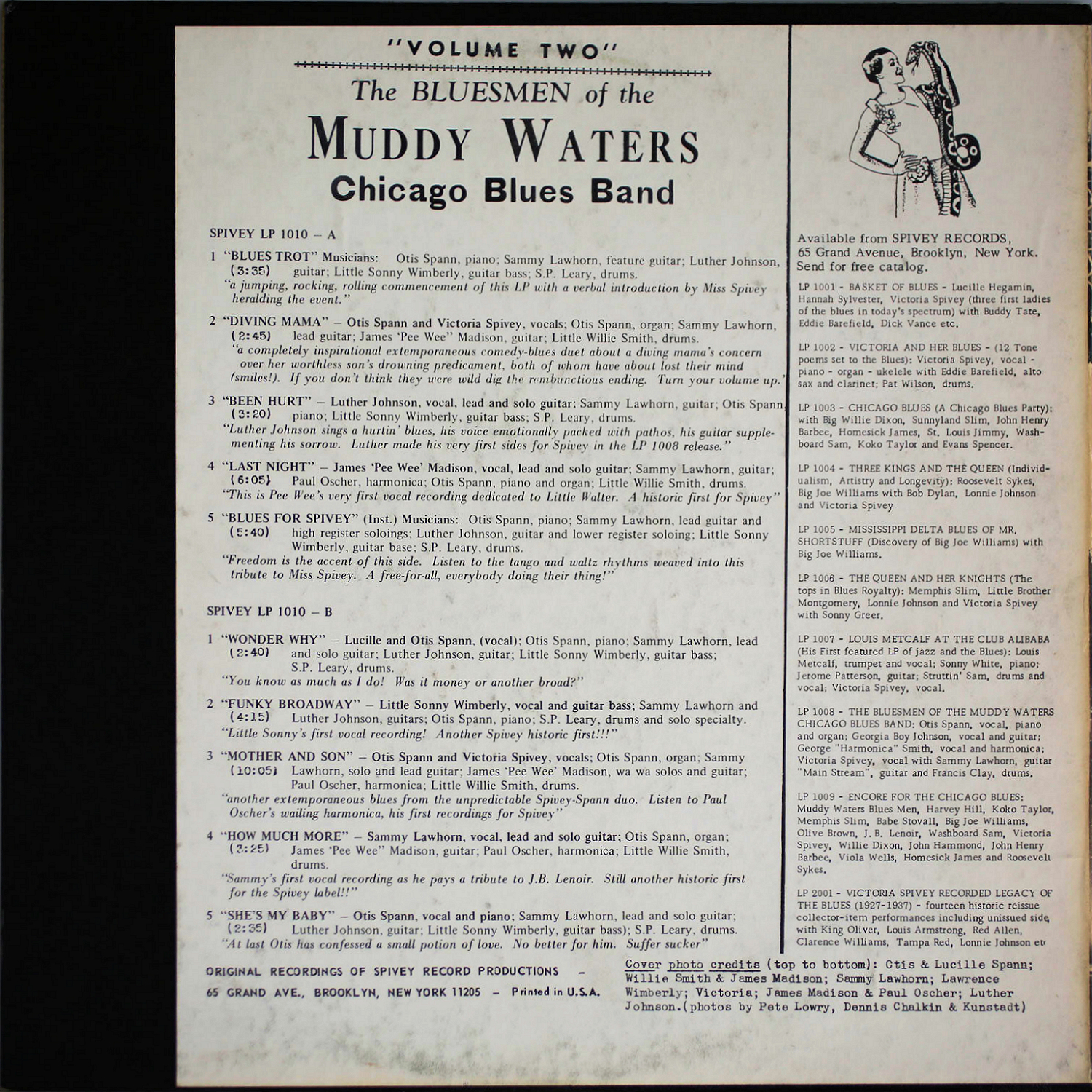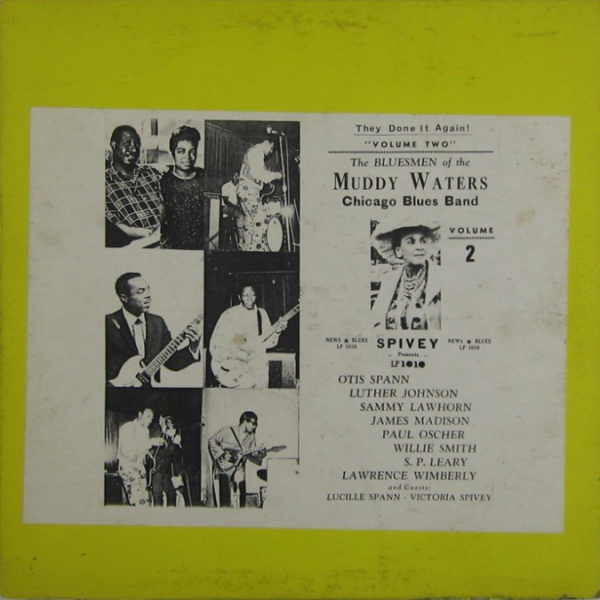 Muddy Waters, Henry Armstrong (club owner) Jerome Green (maraccas), Otis Spann,Henry Strong, "Elgin Edmonds" [Elga Edmonds], Jimmy Rogers (presumably from the early 1950s) source: Mike Rowe: Chicago Blues - The City and the Music.- New York (Da Capo Paperback) 1975,first published in 1973 as "Chicago Breakdown", p. 146 ("from Chess files")
