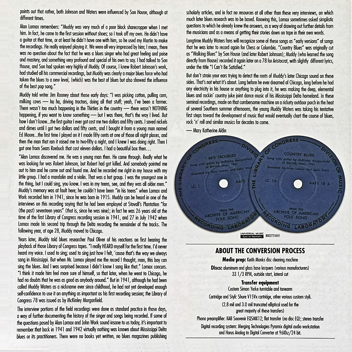 original photo (1948) --- unflipped & a bit photoshopped photo --- photo on MCA/Chess CD 9344 (1993)Muddy Waters, most likely 1948source: Front cover of MCA/Chess CD 9344 (US 1993) "The Complete Plantation Recordings 1941-42"photographer unknownphoto in the middle "unflipped" (watch the breast pocket!) and a bit photoshop embellished by Stefan WirzThe photo most likely has been taken at a photo studio in Chicago, IL [not "Mississippi"!], and shows Muddy Watersholding his first commercial record, Aristocrat 1302 [not "LoC AAFS 18"!], which had been released in March 1948.