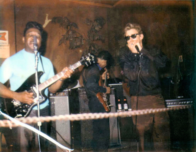 Muddy Waters, Luther "Georgia Boy" Johnson (with his back to the camera) and Paul Oscherat Helen Hermes' Moonlight Lounge on Goode Ave [now Annie Malone Dr] in St Louis, Missouri, c. 1968Photo (taken by a Polaroid photographer in the club) posted at facebook by Paul Oscher (07/14/2019), photoshop embellished by Stefan Wirz
