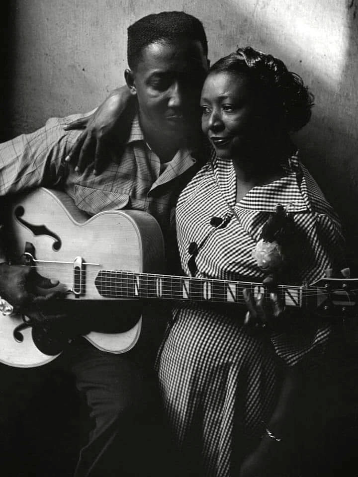 original photograph // cropped versions floating the internet Muddy Waters with his wife Geneva (née Ward, 1915 - March 16, 1973, they married in 1940), 1951Muddy is holding a Kay archtop acoustic guitar with a Dearmond Rhythm Chief pickup (Model 1000, first advertized in November 1948)source: https://www.pinterest.de/pin/733031276849725382/visual-search/; photographer: Art ShayArt Shay's recollections of the photograph above: "The editor of the New Yorker ended his review of the new Keith Richards book Life with a plangent line from Richards asserting he could never be as good as Muddy Waters or as black. I met the generally acknowledged Father of Rock and his wife Geneva in 1951. Time magazine had sent me to the south side club in which he was performing. I arrived early as usual and there he was, strumming his guitar and cuddling his woman in the hallway. Slivers of dying winter light came down across the pair from some blessed window giving me barely enough natural light. He strummed a greeting using my name letter by letter. Billy Corgan noticed the first print of Muddy in the trunk of my car and bought it to hang in his studio next to vintage prints of some other music giants like the Beatles, Billie Holliday, and Ella Fitzgerald." (source: The Chicago Blog (Alan Thomas), 2012) Muddy Waters with his wife Geneva and their granddaughter (which they raised) Amelia "Cookie" Cooperin their home at 4339 South Lake Park in Chicago, Illinois, November 1959source: Internet; photographer: Georges AdinsAmelia 'Cookie' Cooper is the daughter of Muddy Waters' (and Leola Spain's) first child Azelene Morganfield (May 1, 1935 - June 18, 1963) and her boyfriend J.B. Cooper "Muddy Waters Injured; 3 Killed In Auto Mishap"; source: JET magazine Vol. XXXVII, # 6 (November 13, 1969), p. 70"Blues Singer Hurt; 3 Others Die In Crash"; source: Chicago Tribune, October 28, 1969, p. 26The accident happened 11 a.m. on October 27, 1969 (Gordon 2002, p. 217)