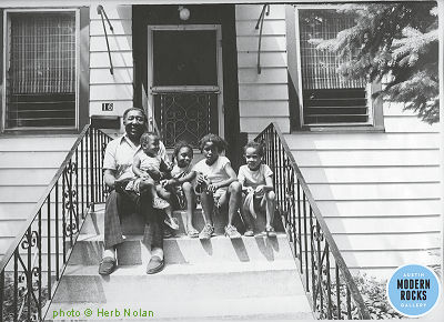 Muddy Waters at his [1974-1983] home, 16 South Adams St. in Westmont, Illinois, 1978l to r: Muddy Waters, great-granddaughters NaCherrie & Chandra "Peaches" Cooper,daughter Ros(a)lind [born March 3, 1970] & a friend of theirs, Lisa source of photo: http://www.modernrocksgallery.com/chicago-jazz-blues-archive-herb-nolan/muddy-waters; photographer: Herb Nolan(Depicted persons identified by Joseph Morganfield on his facebook timeline)