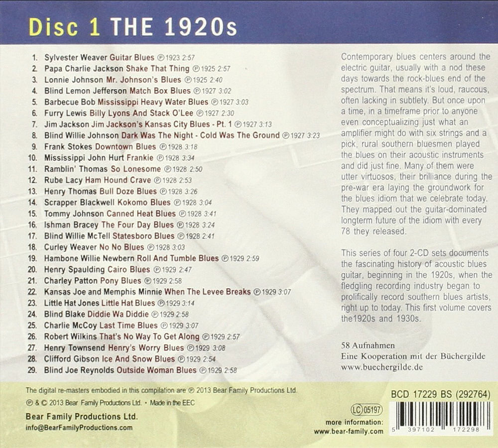 notes by Richard Spottswood = CBS CD CK46218 (US 1990)= CBS CD 467251 (EU 1990) (Roots n' Blues series)