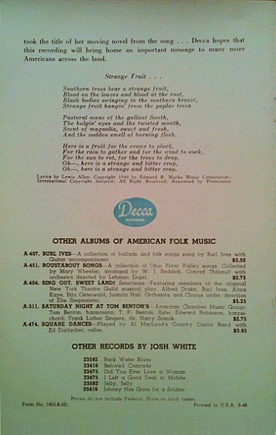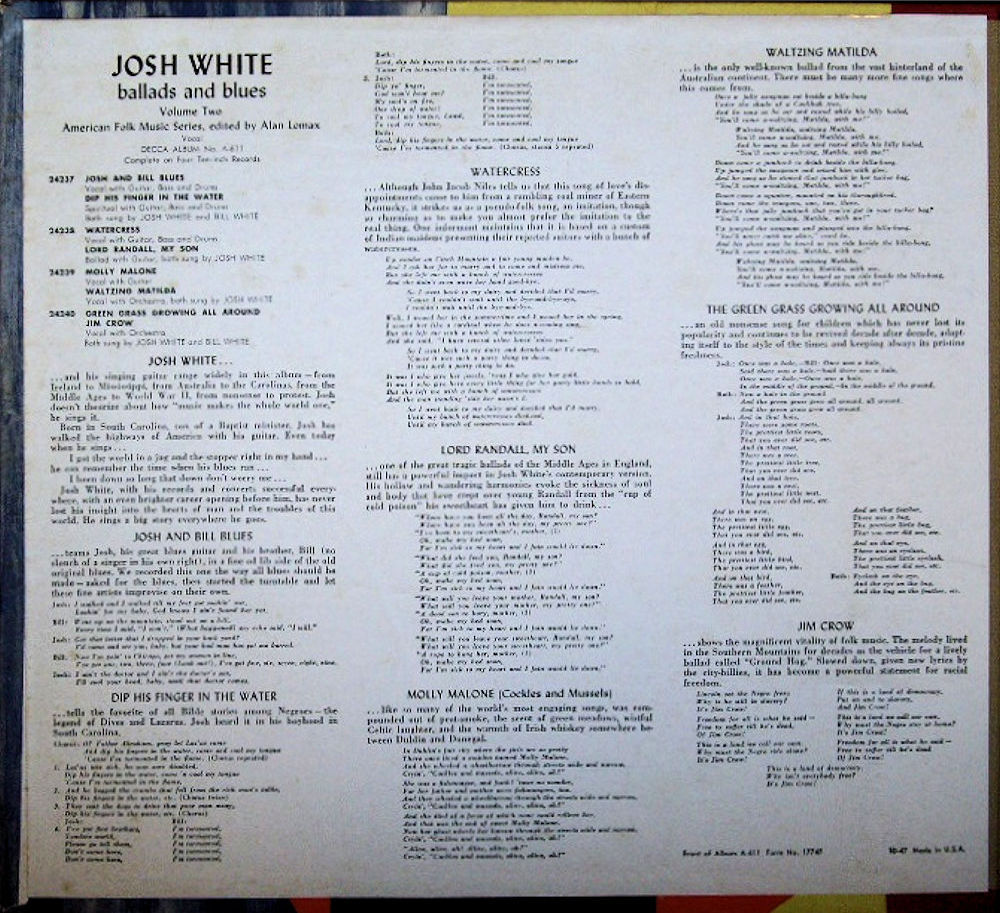 Commentary by Robert Shelton (The Josh White Songbook, Quadrangle Books, Chicago, 1963): "The tragicomic song of a man without enough money to buy the meal he wanted. This version was adapted and composed by Hy Zaret and Lou Singer in 1944, and thereafter Josh was the chief popularizer of the song. According to the folklorist Kenneth S. Goldstein, a Latin Professor at Harvard had written a ditty in 1850 called 'The Lay of One Fishball.' Twelve years later, Francis James Child, the great authority on British ballads, composed a burlesque operetta in Italian on the song, called 'Il Pesceballo.' The 'mock operetta' was translated into English by James Russell Lowell, the famous poet, and performed in Cambridge for the benefit of Union soldiers in the Civil War. The song and opera then dropped into obscurity, until 1944."